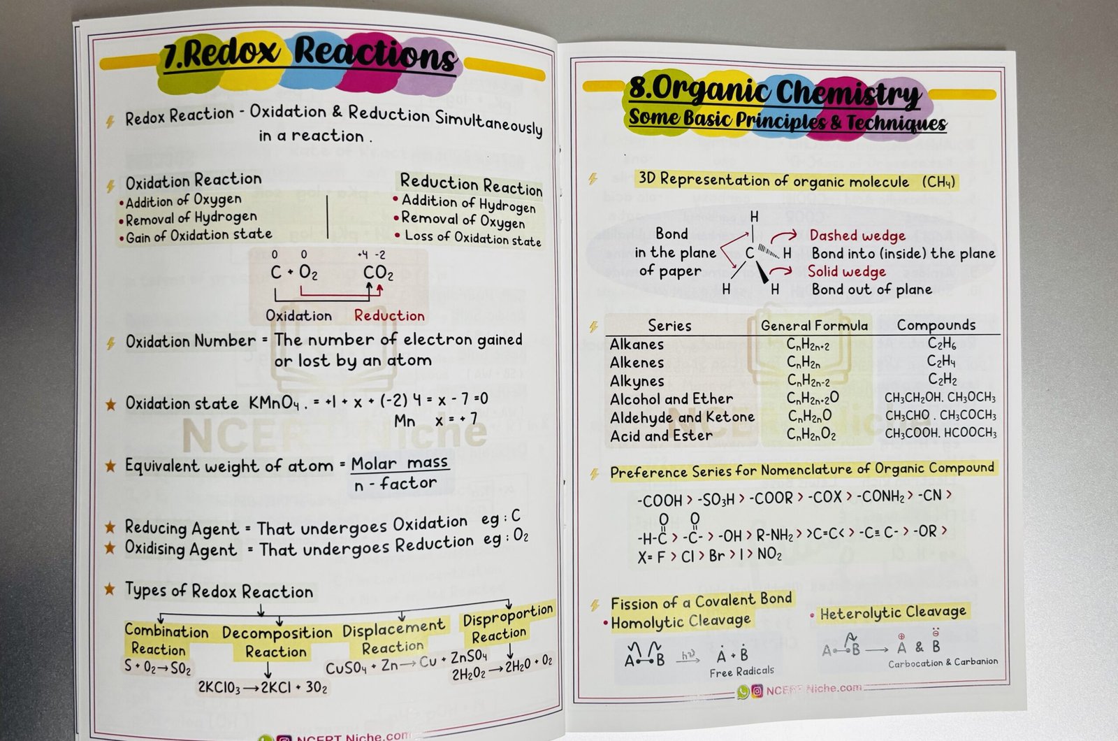 Visual organization plays a critical role in retaining complex Chemistry information. This product is presented in a colorful, easy-to-read format that categorizes formulas and reactions effectively. The use of vibrant colors makes navigation through topics intuitive, helping students engage more actively with their studies. It’s not just a formula sheet; it’s a tool designed to boost comprehension and memory retention. The topper’s handwriting style further enhances the personalized feel of this unique study tool.